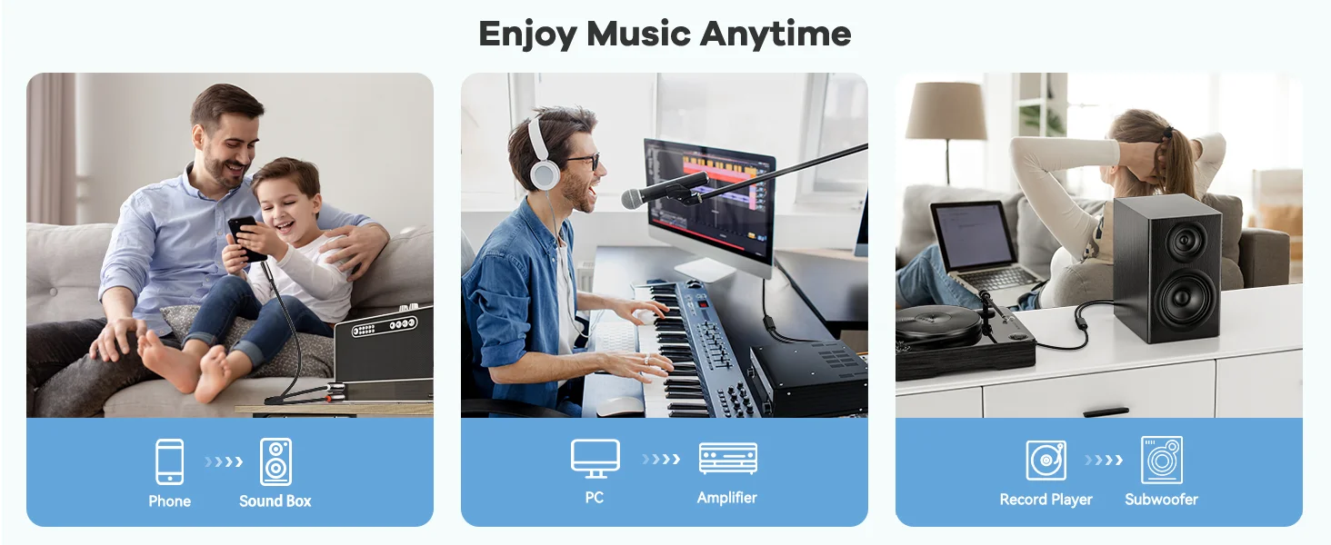 3.5mm male to 2RCA male audio cable is compatible with Phones, MP3 players, CD players, laptops, tablets, and any other digital device with a 3.5mm audio jack; and home audio systems and more with RCA connectors.
